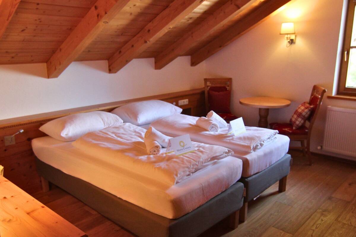 On the ground floor, the spacious living room offers stunning views. It features a cosy seating area with an open fireplace and a large flatscreen TV, perfect for reflecting on the day's adventures with friends or family. Meanwhile, your chalet hosts will be preparing a delicious three-course dinner in the kitchen. This separate space, adjacent to the living room, also includes the dining area, where your meal will be served. Thanks to the open kitchen layout, it’s easy to interact with your chalet hosts. After dinner, you can linger at the table or sink into the comfortable sofas. Also on this floor is the master bedroom—a double room with an ensuite bathroom featuring a bathtub. If desired, this room can be converted into a four-person bedroom.